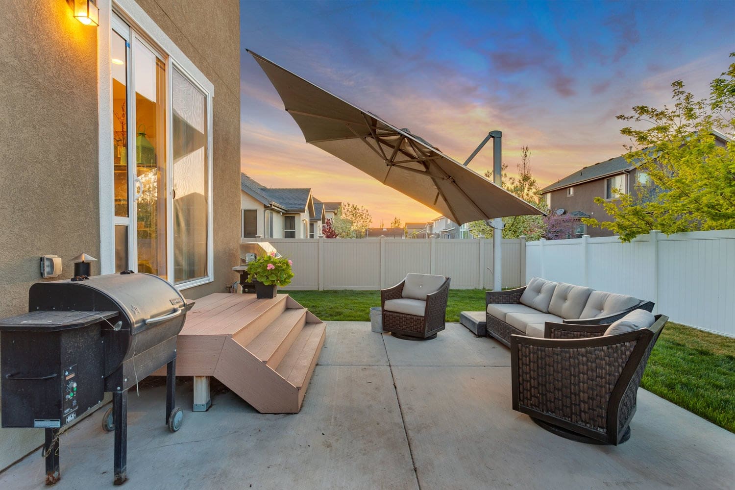 Welcome home! This better than new, life giving home is full of natural light due to soaring vaults throughout and floor to ceiling windows in the Great Room. Entertain to your heart’s content with the wide open concept floor plan, upgraded gourmet kitchen with quartz countertops, stainless steel appliances, and sprawling backyard space. When all the fun is done, retire to your grand master suite with all of the features: vaulted ceilings, double vanity, soaking tub, huge shower, privacy toilet, and enormous walk in closet. Come see this stunning home while you can, it won’t last long!